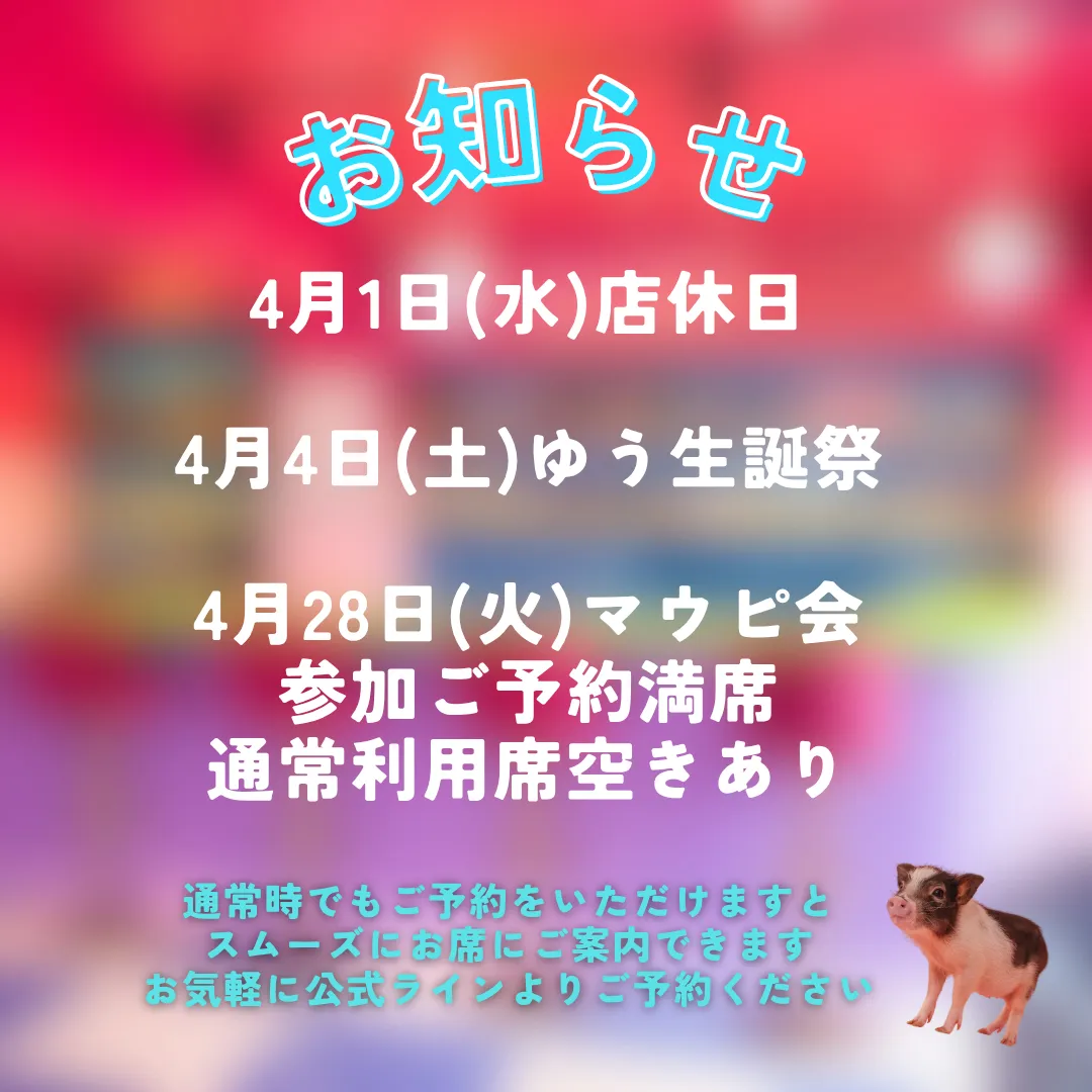 4月の定休日などのお知らせ📢 2026/04/01 4月のお知らせ📢 1日(水)定休日とさせていただきます。 4日(土)ゆう生誕祭🥂 28日(火)マウピ作り会満席 通常利用はお席空きあります! ご来場の際はお気をつけてお越しくださいませ♪ ご予約やお問合せは公式ラインにて 随時、お待ちしております🦄